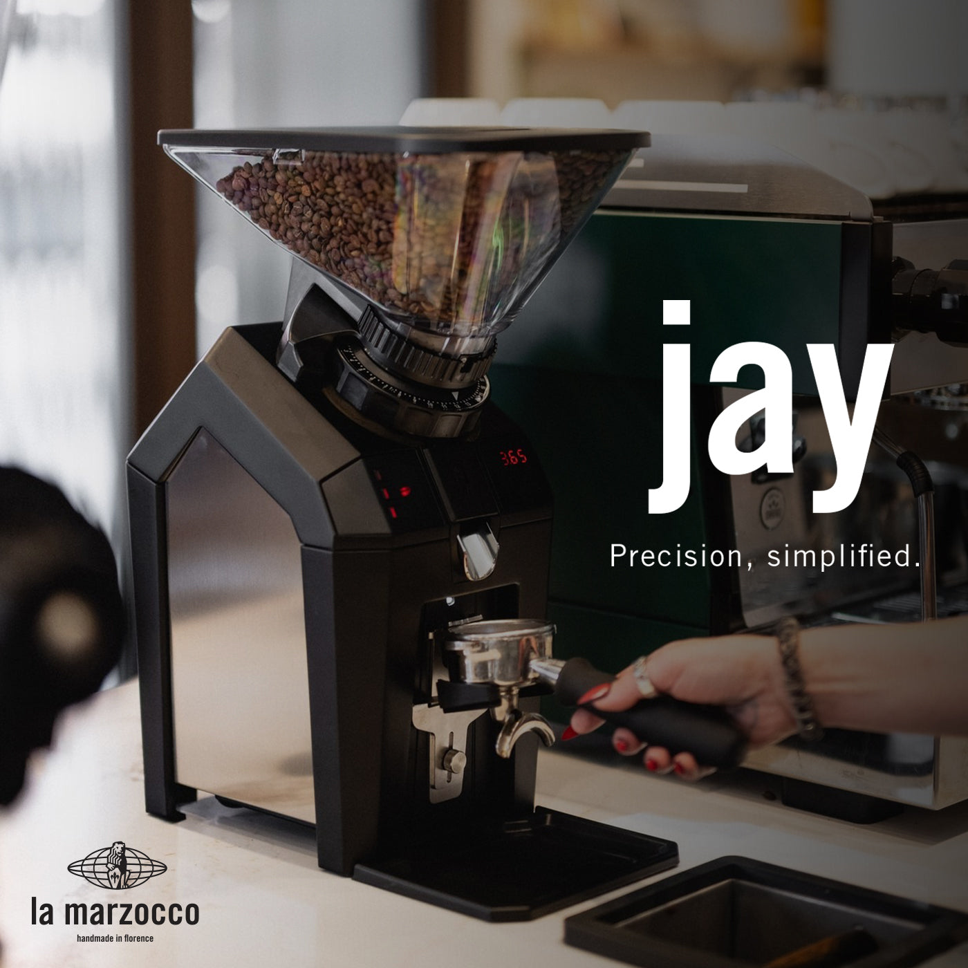 Combined with an intuitive interface for easy programming and use, a patented burr alignment system, and smart connectivity for grind-by-weight accuracy, Jay quickly delivers exceptional consistency and quality in every shot.